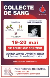 Lorraine, 20 avril 2021. – Les 19 et 20 mai prochains se tiendra la 9e édition de la collecte de sang de l’école Le Tournesol, un établissement situé à Lorraine. Cette collecte est dédiée à la douce mémoire de Xavier-Tristan Péloquin, un élève qui a fréquenté l’école de 2012 à 2015. Il est décédé en janvier 2016